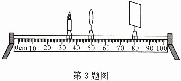 3. 小军做“探究凸透镜成像的规律”实验时,将焦距为 10 cm 的凸透镜固定在光具座上 50 cm 刻度线处,光屏和点燃的蜡烛分别位于凸透镜两侧,蜡烛放置在 35 cm 刻度线处,如图所示。移动光屏,直到在光屏上呈现烛焰清晰的像。下列说法正确的是( )