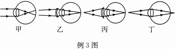 例3 如图所示,下列有关眼睛成像的示意图,远视眼是______图,远视眼矫正是______图。