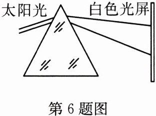 6. 如图所示,一束太阳光通过三棱镜折射后,被分解成各种颜色的光,在白色光屏上形成一条光带,这个现象叫____;如果在白色光屏前放置一块红色玻璃,我们在白色光屏上能看到____;如果将白色光屏换成绿色纸板,我们能看到____。