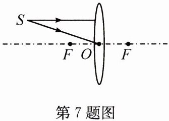7. 如图所示,点光源S位于凸透镜一侧。在图中画出S发出的两条光线通过凸透镜后的折射光线。