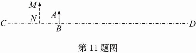 11. 如图为某透镜成像的一种情况,其中AB是物体,CD是主光轴,MN是AB的像。试在图上的适当位置画上合适的透镜,并用作图法作出该透镜右侧的焦点F。