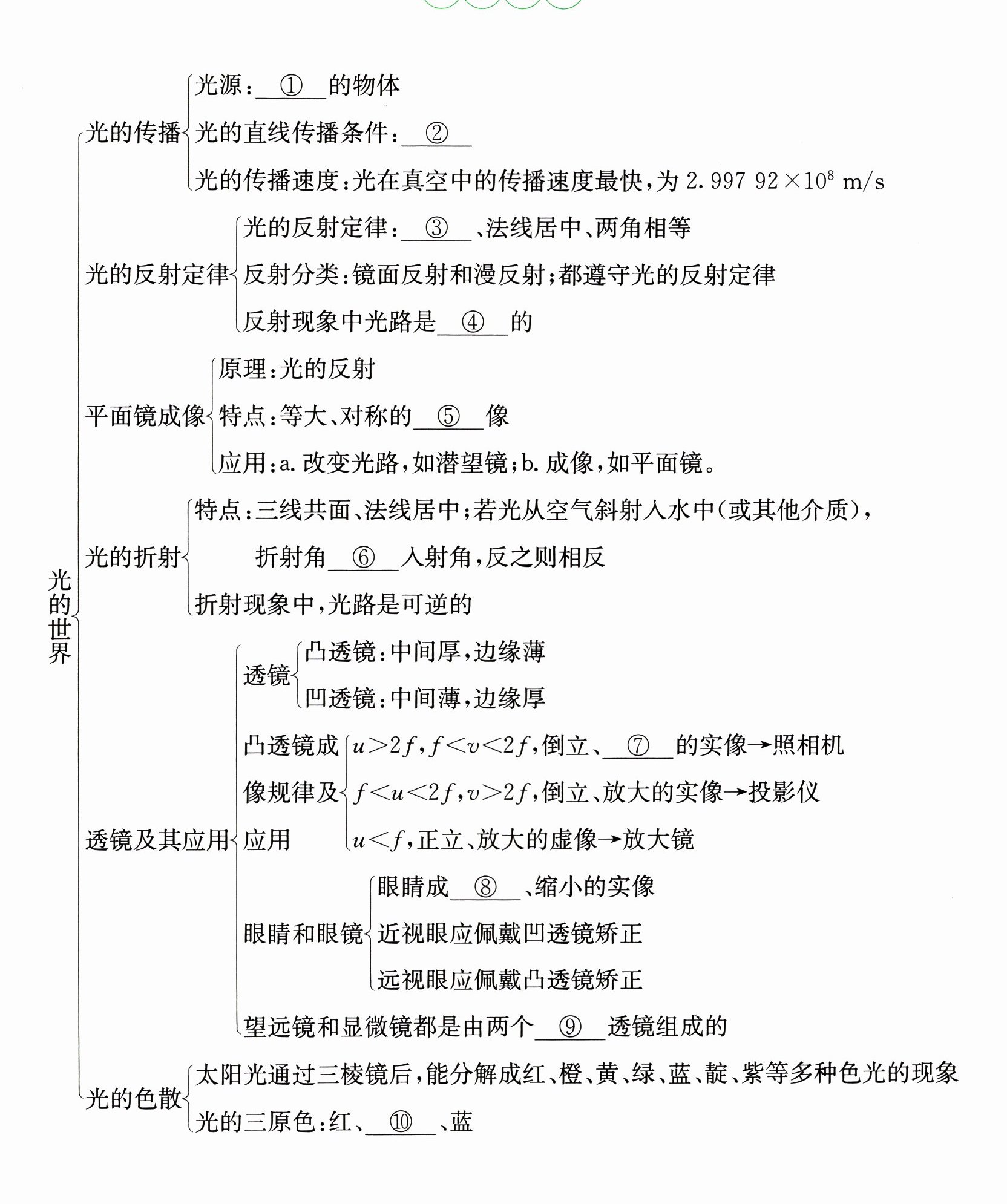①能够自行发光;②同种均匀介质;③三线共面;④可逆;⑤虚;⑥小于;⑦缩小;⑧倒立;⑨凸;⑩绿