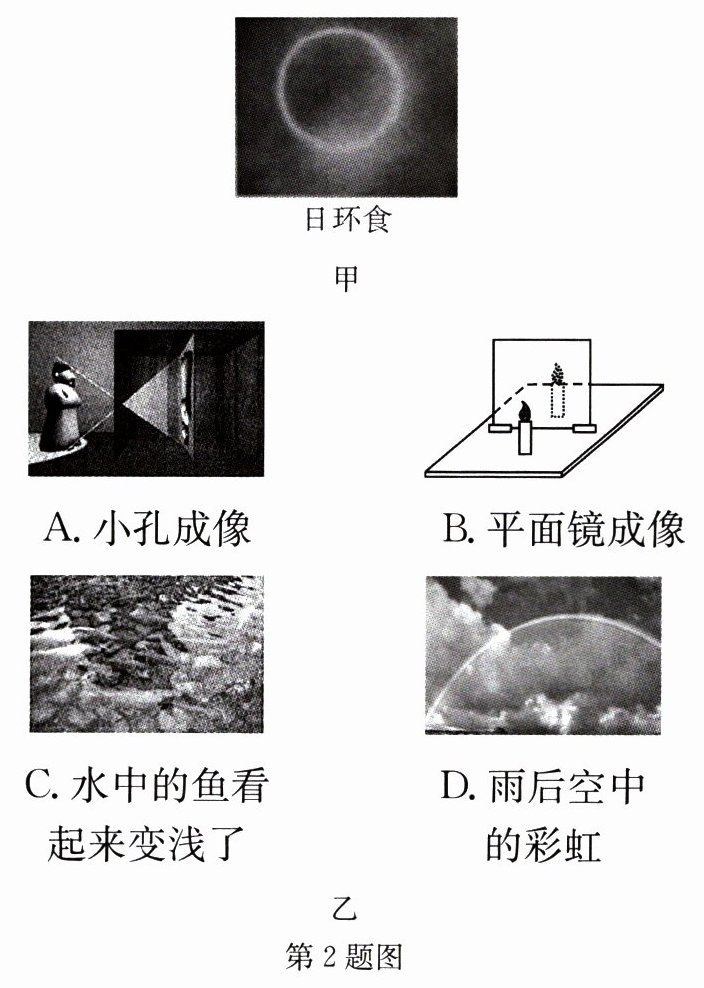2. 经测算,2030年6月1日,我国东北地区将出现日环食现象,如图甲所示。则下列图乙中的光学现象与日环食现象原理相同的是( )