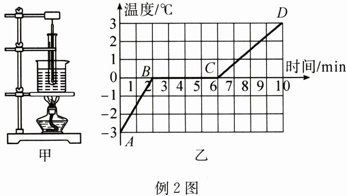 例2 小华同学利用如图甲所示的装置探究某物质熔化的特点,他每隔1min记录一次温度计的示数,观察物质的状态,并作出温度随时间变化的关系图像,如图乙所示。