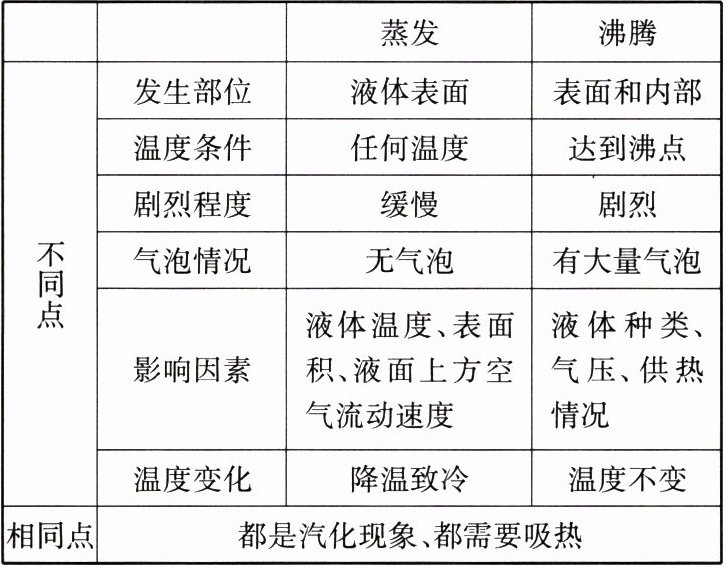 一、1.液 气 2.吸 二、蒸发 沸腾 三、1.表面 缓慢 2.①温度 ②表面积 3.吸 四、1.表面 内部 2.升高 3.沸点 吸 4.不变 吸 5.100
