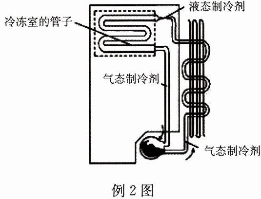 例 2 如图所示是冰箱制冷剂循环路线示意图,制冷剂在冷冻室的管子里发生的物态变化是______,此过程______(选填“吸热”“放热”或“不吸放热”),气态的制冷剂在压缩机中又会变成液态,这是利用______的方法使气体液化的。