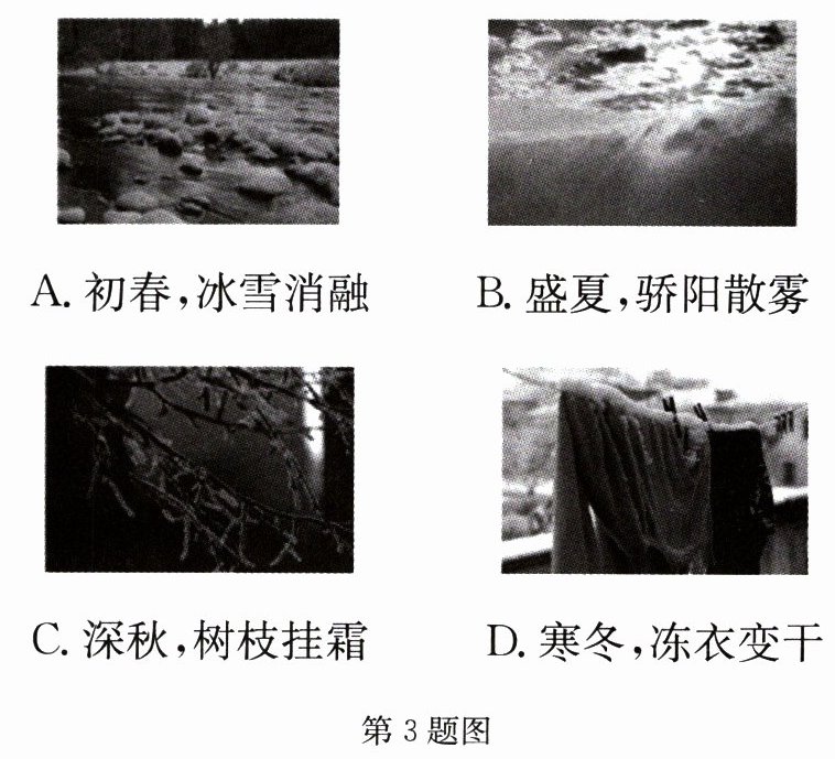 3. 如图所示是自然界中一年四季所出现的物态变化过程,发生升华现象的是( )
