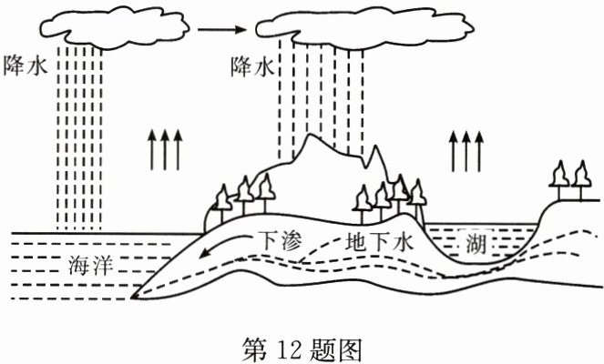 12. 如图所示是大自然中水循环现象的示意图。江、河、湖、海以及大地表层中的水不断蒸发变成水蒸气。当含有很多水蒸气的空气升入高空时,水蒸气的温度降低凝结成小水滴或小冰晶,这就形成了云。在一定条件下,云中的小水滴或小冰晶越来越大,就会下落,在下落过程中,小冰晶又变成小水滴,与原来的水滴一起落到地面,这就形成了雨。