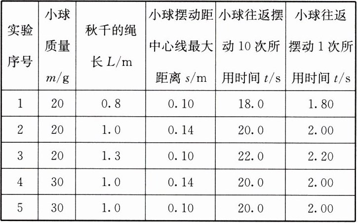 (2)她们改变小球的质量和细绳的长度,分别测出不同情况下小球往返摆动 10 次所用的时间,得出表中的实验数据: