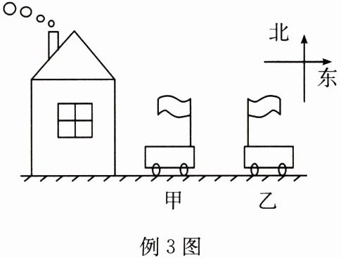 例3 烟囱上的烟和路面上两小车上的旗帜飘扬情况如图所示。以下关于两小车运动状态的判断正确的是( )