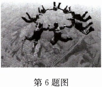 6. 如图所示是高空跳伞运动员极速下降过程中的一个画面,在图示的情景中,以地面为参照物,他们是______的,以其中一个运动员为参照物,其他运动员是______的。(均选填“静止”或“运动”)