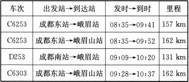 11. 便捷的交通与互联网给人们出行带来很大的方便。某天,小明一家想乘高铁去峨眉山风景区游玩,通过网站查询列车时刻表,如表所示。