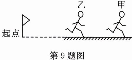 9. 如图是某校学生在水平直道上进行1000m跑步比赛的情景。甲、乙两位同学同时出发,甲同学在整个比赛过程中做匀速运动。乙同学出发后,经过100s通过的路程为400m,此时他发现比甲同学落后100m;接着乙同学以6m/s的速度追赶,经过50s没有赶上;然后乙同学发起冲刺,最后比甲同学提前10s到达终点。则甲同学在比赛中的速度为______m/s。乙同学出发后,前100s内的平均速度为______m/s;乙同学最后冲刺的平均速度为______m/s。