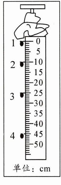 3. 在研究水滴下落规律的实验中,打开水龙头让水一滴一滴下落,并用频闪照相机每隔0.1s拍摄了同一水滴下落时的不同位置,如图所示。由图可知,这滴水运动到4位置时,运动的时间为______s,运动的平均速度为______m/s;这滴水由2位置运动到3位置平均速度为______m/s;水滴下落0.2s运动的距离是______cm,平均速度是______m/s,该水滴下落过程中做______(选填“匀速直线”或“变速直线”)运动。