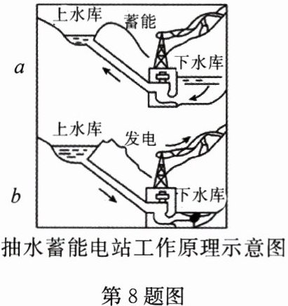 8. (2024·东城区校级月考)河北丰宁抽水蓄能电站将低谷过剩电能转换为高峰电能,被誉为世界最大的“超级充电宝”。抽水蓄能电站在用电低谷时,用过剩电力抽水储存、在用电高峰时放水发电。如图所示,当风、光发电量大用不完时,电站从下水库向上水库抽水蓄能(a)。当风、光发电量不足时,电站则向下水库放水发电(b)。下列说法错误的是( )