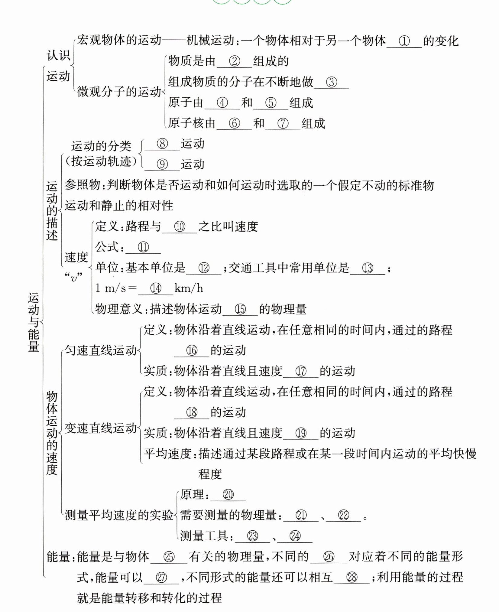 ①位置;②分子;③无规则运动;④原子核;⑤核外电子;⑥质子;⑦中子;⑧直线;⑨曲线;⑩时间;⑪$v = \frac{s}{t}$;⑫m/s;⑬km/h;⑭3.6;⑮快慢;⑯相等;⑰不变;⑱不相等;⑲变化;⑳$v = \frac{s}{t}$;㉑路程;㉒时间;㉓刻度尺;㉔停表;㉕运动;㉖运动形式;㉗转移;㉘转化