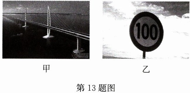 13. 港珠澳大桥是一座连接香港、珠海和澳门的桥隧工程(如图甲所示),全长 55 km,其中主桥长 29.6 km,香港口岸至珠澳口岸 41.6 km。桥面为双向六车道高速公路,全程小轿车限速如图乙所示。若某小轿车从香港口岸到珠澳口岸的时间是 30 min。则: