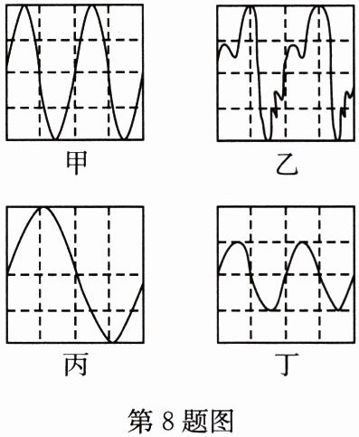 8. 学校某科技小组为了更深入地研究声音的特性,他们把几种声音通过传感器采集并传送到设置相同的声音示波软件中,在显示屏上展示出了以下四个波形图,由图可知,甲和丙两声音的______相同,甲和丁两声音的______相同(均选填“音调”或“响度”)。其中只有______的音色与其余三个不同。