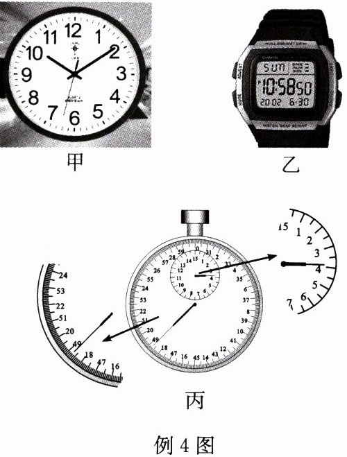 解析 图甲中钟表的分度值是指秒针转一小格的时间;图乙的电子表读数为10:58:50;图丙的分度值是指秒针即长针转一小格的时间,机械秒表读数时,应先观察分针是否过了整刻度之间的半刻度,如果没有过,则表示分针还没有转过一圈,应按少于30s读数;如果分针过了半格,则应按大于30s读数,若刻度旁所标注的数未超过30,则要加上30才为该刻度对应的示数。