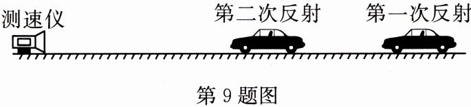 9. 某道路全路段实行分车道限速,内侧、中间车道限速80km/h,外侧车道限速60km/h。隧道段内侧、中间车道限速70km/h,外侧车道限速50km/h。在某段区间测速路段,交管部门在公路上设置了固定测速仪。如图所示,在隧道外中间道路上的一辆汽车向测速仪匀速驶来,测速仪向汽车发出两次短促的超声波信号,第一次发出信号到测速仪接收到信号用时0.6s,第二次发出信号到测速仪接收到信号用时0.4s。若两次发出信号的间隔是1.1s,空气中超声波的速度为340m/s。