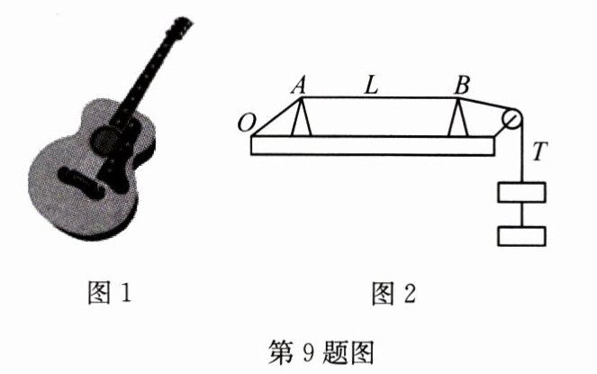 9. 吉他是由两端固定的琴弦产生振动而发声的,如图1所示。为了研究同一根钢制琴弦发声音调与哪些因素有关,可利用图2所示实验装置。一块厚木板上有A、B两个楔支撑着琴弦,其中A楔固定,B楔可沿木板移动以改变琴弦振动部分的长度。将钢制琴弦的末端固定在木板O点,另一端通过滑轮悬挂不同个数的相同重物,重物个数越多,琴弦绷得越紧。轻轻拨动琴弦,在AB间产生振动,并用仪器测出发声频率。