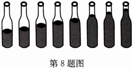 8. 往8个相同的透明玻璃瓶中灌入不同高度、不同颜色的水,用同样大小的力敲击时可发出“1,2,3,4,5,6,7,i”的音,发出声音的响度______(选填“相同”或“不同”),最右边瓶发出的是______(选填“1”“2”“3”“4”“5”“6”“7”或“i”)音。