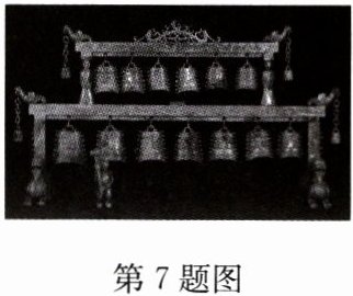 7. 如图所示是一套大型编钟,用钟锤敲击编钟,编钟会因______而发出声音,轻敲或重敲编钟同一位置所发出声音的______(选填“音调”“响度”或“音色”)不同。