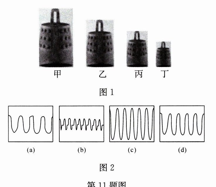 11. 编钟是我国出土的春秋战国时期的乐器。现有四个编钟,如图1所示,它们按从大到小的顺序由左至右排列,其中有一编钟上有一隐形的裂痕,为了查找出这个编钟,用锤子分别敲击它们,将所产生的声波输入示波器中,如图2所示四幅图为示波器中显示的波形图,则敲____波形图对应的编钟时用力最大,____波形图对应的编钟有裂痕,我们能辨别出编钟的声音,是利用声音的____不同。