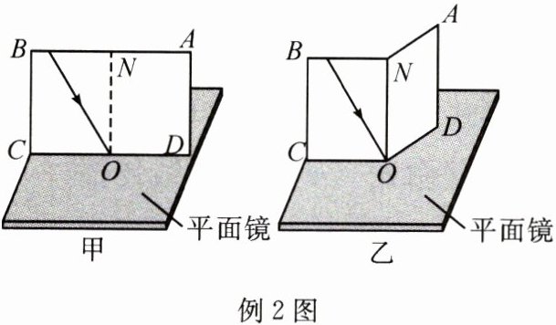 例2 “探究光的反射规律”的实验装置如图甲所示,平面镜放在水平桌面上,标有刻度(图中未画出)的白色纸板$ABCD能绕垂直于CD的ON$轴翻转,在纸板上安装一支可在纸板平面内自由移动的激光笔。