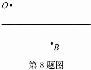 8. 小明($O$点)在平静的湖面上看见树上的小鸟恰好“落”在水中的鱼($B$点)身上。试确定鱼的大致位置($C$点)、小鸟的位置($A$点)及通过水面看到小鸟的光路。