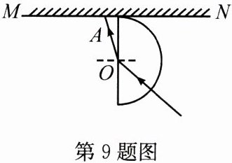 9. 用激光器发出一束光,射入半圆形玻璃砖的圆心$O$,结果在水平屏幕$MN$上出现两个光斑,其中一个光斑在$A$点,如图所示,请在图中画出光路确定另一光斑$B$点的位置。