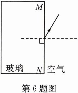 6. 一束光线从空气射入玻璃时,界面$MN$上的反射光线如图所示,请画出对应的入射光线和大致的折射光线。