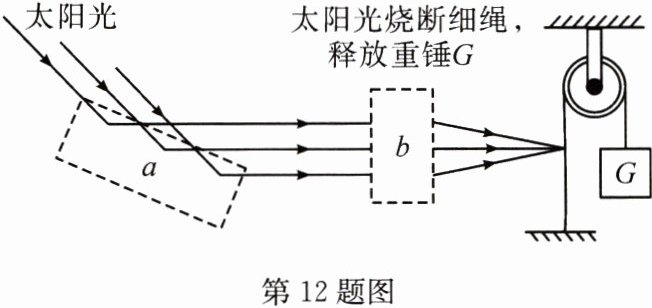 12. 如图是小明自制的阳光自动检测装置的示意图,它利用光学元件改变太阳光的传播方向,从而烧断细绳,使重锤自动落下达到检测目的,图中元件$a$为______镜,元件$b$为______镜。