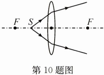 10. 放置在凸透镜主光轴上焦点以内的点光源$S$发出的光通过凸透镜后的光路如图所示。则下列说法中正确的是( )