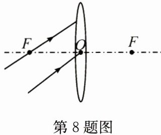8. 如图所示,两条入射光线分别过凸透镜的焦点$F和光心O$,请分别画出经过透镜后的光线。