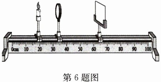 6. 用焦距为10 cm的凸透镜做“探究凸透镜成像的规律”实验。组装并调整实验器材时,应使烛焰和光屏的中心位于凸透镜的______上;找像时,要前后多移动几次光屏,找出成最______像时光屏的位置;当点燃的蜡烛、凸透镜、光屏置于光具座上如图所示的位置时,光屏上呈现烛焰的倒立、______的实像。