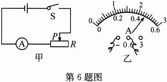 6. 如图甲所示,电源由$n$节新干电池串联而成且电压不变,滑动变阻器$R$上标有“$20\Omega\quad 2A$”字样,闭合开关,小李将滑片$P$滑到变阻器的中点附近时(变阻器接入电阻约为$10\Omega$),电流表的指针如图乙所示。求: