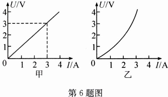6. 在“伏安法测电阻”的实验中,小雪和小彤分别选用定值电阻和小灯泡为测量对象,在处理实验数据时,分别画出了$U-I$图像,如图甲、乙所示。对于图像的分析,以下说法错误的是(