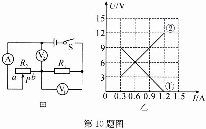 10. 如图甲所示,电源电压保持不变。闭合开关 $ S $,当滑动变阻器的滑片 $ P $ 从 $ a $ 端滑到 $ b $ 端的过程中,两个电阻的 $ U - I $ 关系图像如图乙所示,则下列判断错误的是(
