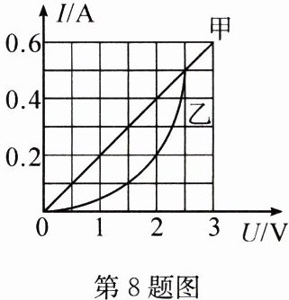 8. 两个电路元件甲和乙中的电流与电压的关系如图所示,将元件甲、乙串联后接在恒压电源两端,流过元件甲、乙的电流是 $ 0.1 A $;若将元件甲、乙并联后仍接在该电源两端,那么流过干路的电流是______