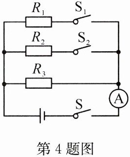 4. 如图所示,电源电压恒定,电阻 $ R_1 = 5 \Omega $、$ R_2 = 10 \Omega $。只闭合开关 $ S $ 和 $ S_1 $ 时电流表示数为 $ 1 A $,只闭合开关 $ S $ 和 $ S_2 $ 时电流表示数可能为(