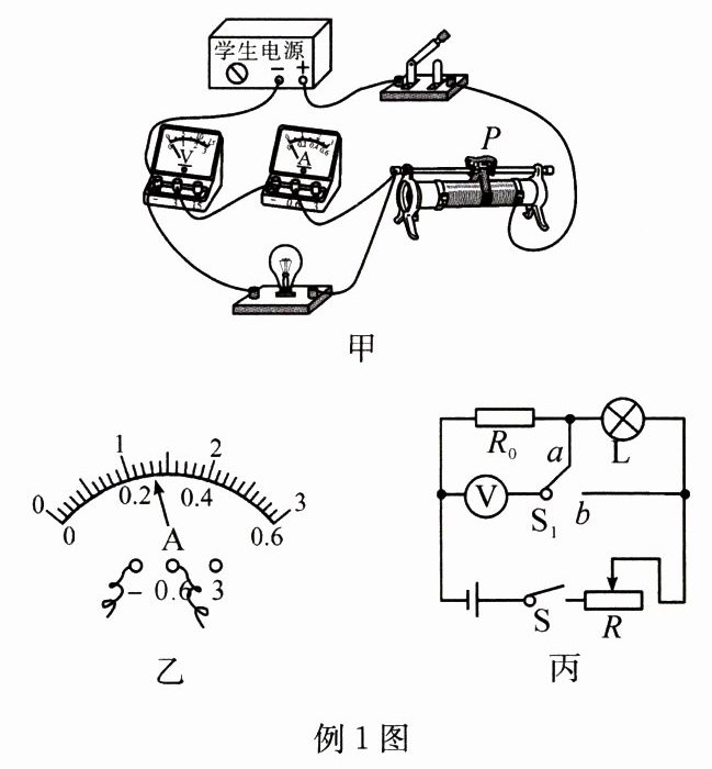 ①闭合开关 $ S $,将开关 $ S_1 $ 拨至 $ a $,调节滑动变阻器的滑片,使电压表的示数与定值电阻 $ R_0 $ 的比值为______时,小灯泡正常发光;
