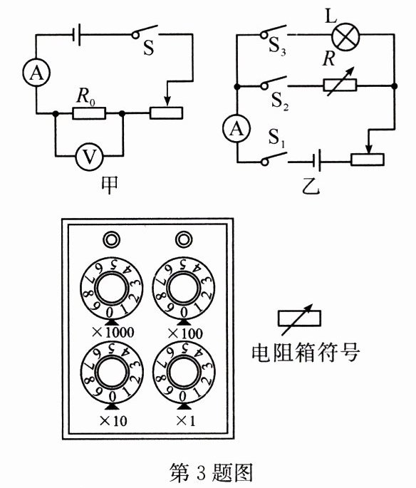 ,读出此时电阻箱 $ R $ 的阻值为 $ R_0 $;③通过实验可知,灯泡 $ L $ 正常发光时的电阻为
