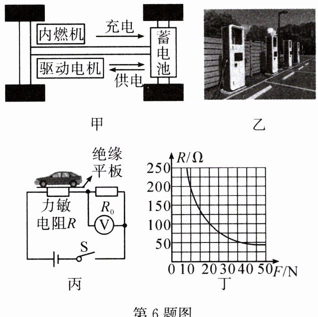$ J $(忽略蓄电池发热和蓄电池驱动电机时造成的热损失)。(4)在高速路入口,交通部门常用“地磅”检测车辆是否超载。为了研究地磅的工作原理,学习小组设计了模拟地磅原理的简化电路图,如图丙所示。电源电压恒为 $ 6\ V $,定值电阻 $ R_0 $ 为 $ 100\ \Omega $,电压表量程为 $ 0 \sim 3\ V $,力敏电阻 $ R $ 的阻值随所受压力 $ F $ 的变化关系如图丁所示。力敏电阻 $ R $ 上方紧密连接一轻质绝缘平板,检测时将汽车模型静置于其上。($ g $ 取 $ 10\ N/kg $)