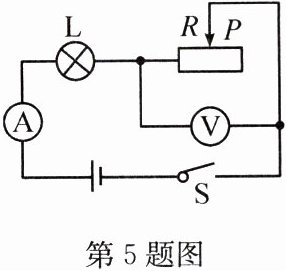 5. (2024·海南)如图所示,电源两端电压恒为 $ 6\ V $,小灯泡 $ L $ 的阻值为 $ 8\ \Omega $,额定电压为 $ 4\ V $,滑动变阻器 $ R $ 标有“$ 20\ \Omega\ \ 1.5\ A $”,电流表量程为 $ 0 \sim 0.6\ A $,电压表量程为 $ 0 \sim 3\ V $,电路工作时不考虑灯丝电阻变化。闭合开关 $ S $,滑片 $ P $ 向左滑动时,电压表示数 ______ (选填“变大”“变小”或“不变”);为保证电路安全,滑动变阻器接入电路的阻值范围为 ______ $ \Omega $。