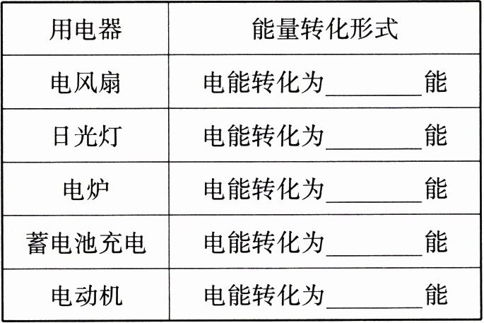 。下表是一些用电器工作时能量转化的形式:|用电器|能量转化形式|