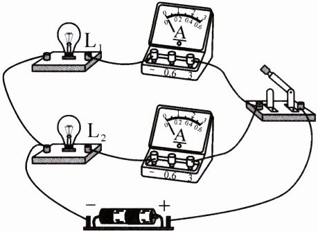 如图所示,把两盏规格不同的小灯并联,用电流表分别测量通过它们的电流,同时观察比较小灯的发光情况。