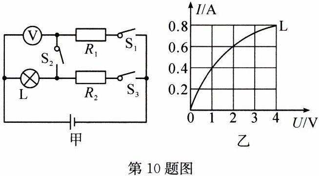 10. 如图甲所示,电源电压恒定不变$,R_1$的阻值为10Ω,图乙是小灯泡L的电流与电压关系的图像。当只闭合$S_1、$$S_2$时,电压表示数为2V,通过小灯泡的电流为