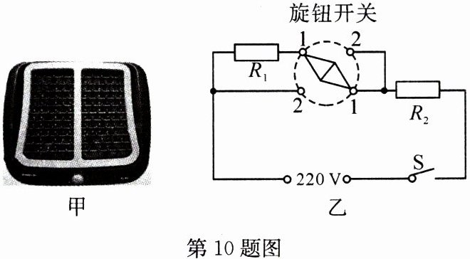 10. 如图甲所示是一款电热暖脚器,可通过旋钮来实现高、低温挡位切换,其内部简化电路如图乙所示,图中$R_{1}$、$R_{2}$均为加热电阻(阻值不变)。该暖脚器高温挡的功率是$440\ W$,低温挡的功率是$110\ W$。问: