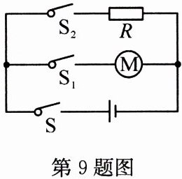 9. (2024·福建)小闽设计的车载可加热果蔬搅拌机工作电路图如图。电热丝$R的阻值为4\ \Omega$,电动机标有“$12\ V\ \ 24\ W$”字样。闭合开关$S$、$S_{1}$,电动机正常工作。求: